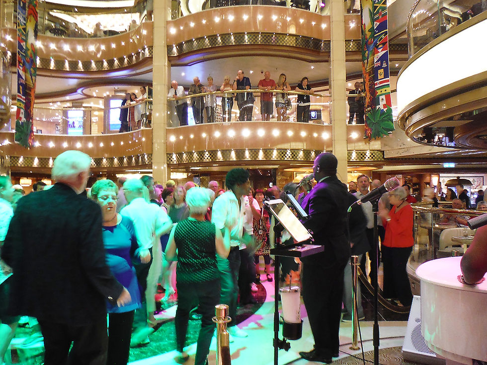 We were walking to the Atrium from an excellent dinner in the main dining room, and saw there was a 60s Rock 'n Roll dance party. Since Pete was in a tux and I was wearing a gown (with heels!), we hurried up to the room and changed into comfy clothes so we could dance.